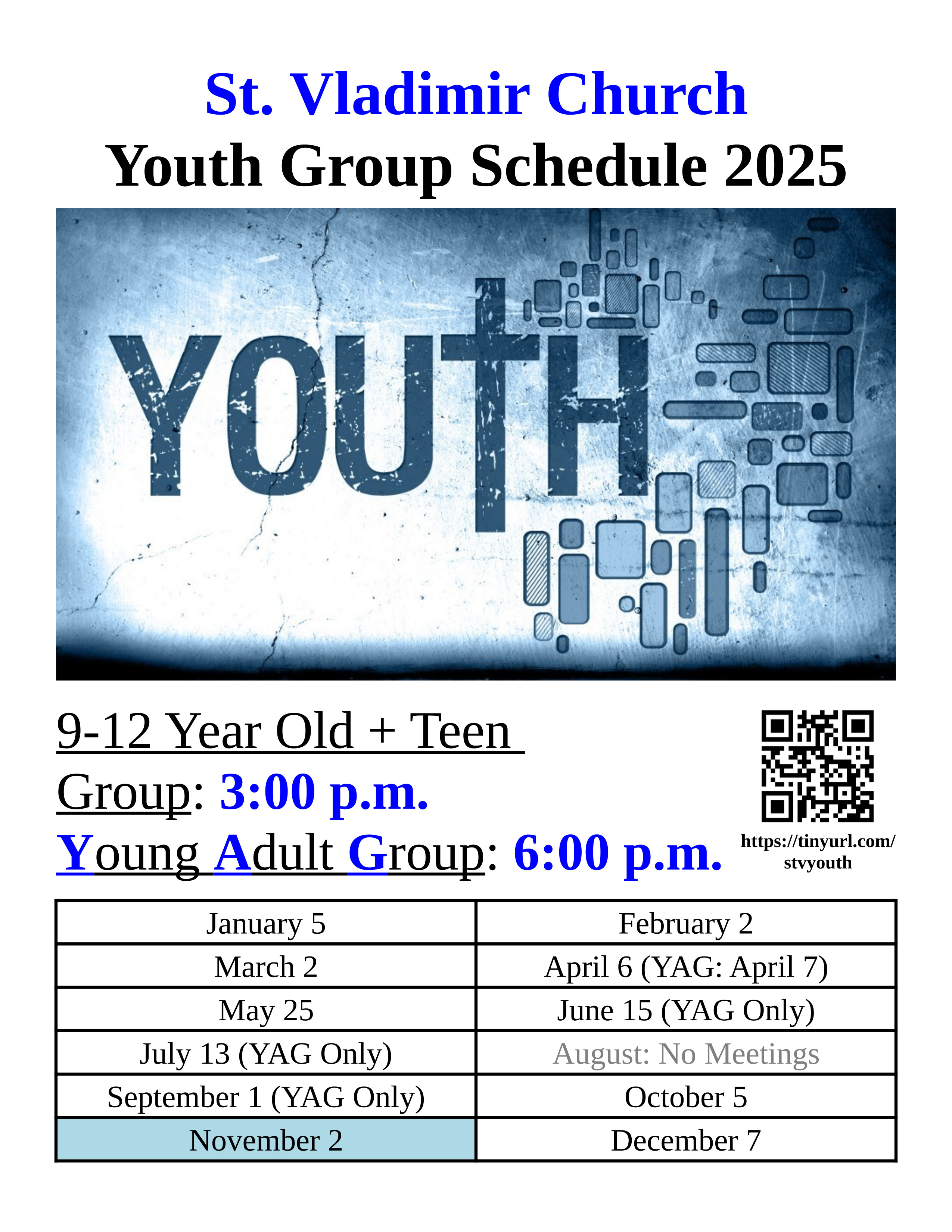 Please plan to join us on November 2 for all our Youth Groups: 9-12, Teen, Young Adult!